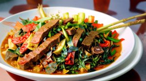 Char Kroeung Sach Ko is a traditional Cambodian dish made by stir-frying beef with an aromatic spice paste called” “kroeung,” which includes lemongrass, galangal, garlic, turmeric, and kaffir lime leaves.